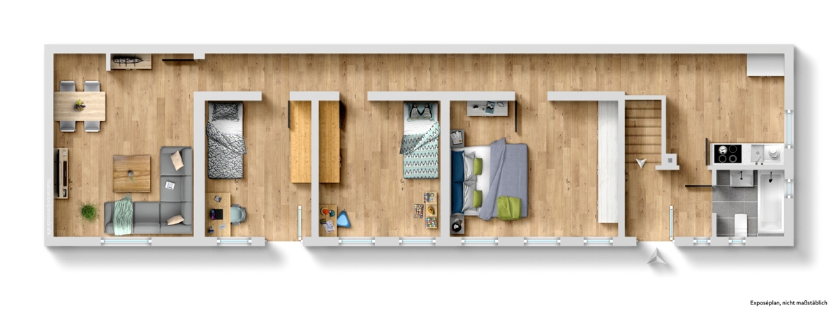 Die Einheit besteht aus vier separaten Zimmern, die sich ideal für eine WG oder Studierende eignen, die gemeinsam wohnen, aber dennoch ihre Privatsphäre schätzen.