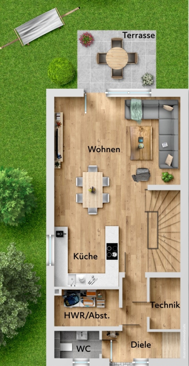 Im Erdgeschoss überzeugen die Häuser mit einem offenen Wohn- und Essbereich samt integrierter Küche und direktem Zugang zur Terrasse und in den Garten. Ergänzt wird das Erdgeschoss durch ein Gäste-WC, eine Diele sowie einen praktischen Hauswirtschafts- und Technikraum.