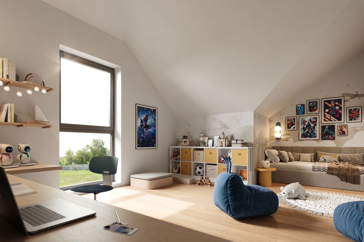 Im Obergeschoss befinden sich zwei komfortable Schlafzimmer, ein modernes Tageslichtbad mit Wanne und Dusche sowie ein Abstellraum. Das ausgebaute Dachgeschoss bietet zusätzlichen Platz mit zwei weiteren Zimmern – ideal als Kinder-, Gäste- oder Arbeitszimmer – sowie einem weiteren Raum, der sich flexibel als Büro oder Stauraum nutzen lässt.